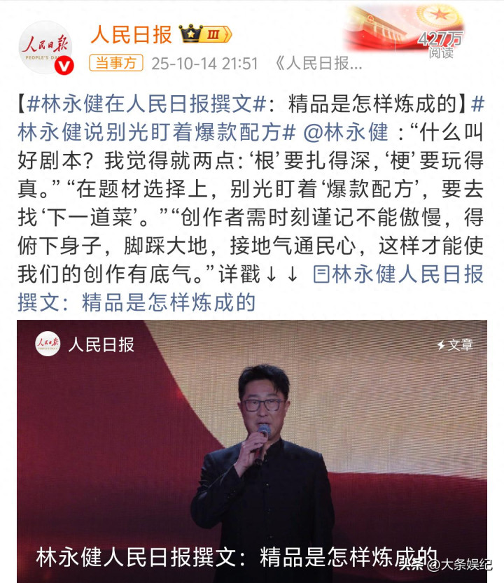林永健在人民日报写了一篇名叫《精品是怎样炼成的》文章,很直击要点,说的全是近年来观众在看剧后反映的问题,不能只盯着爆款题材,不要态度傲慢。有些主创团队没有深入经历过写的一团糟,不听取观众意见10大配资公司,播出效果理想反倒怪观众不懂得欣赏。