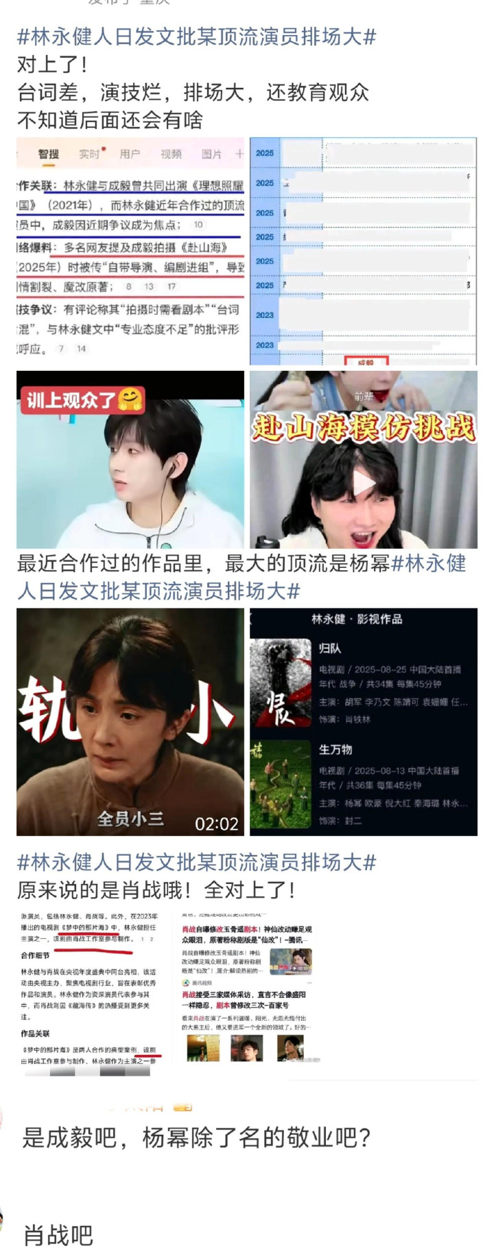 有人专门统计了跟他合作过的算是顶流的演员。提及次数最多的这三位里真正意义上合作过的是肖战和杨幂,成毅演的和他不是一个单元的,没有交集。但是肖战和杨幂也从没听说过和老戏骨合作还改剧本。