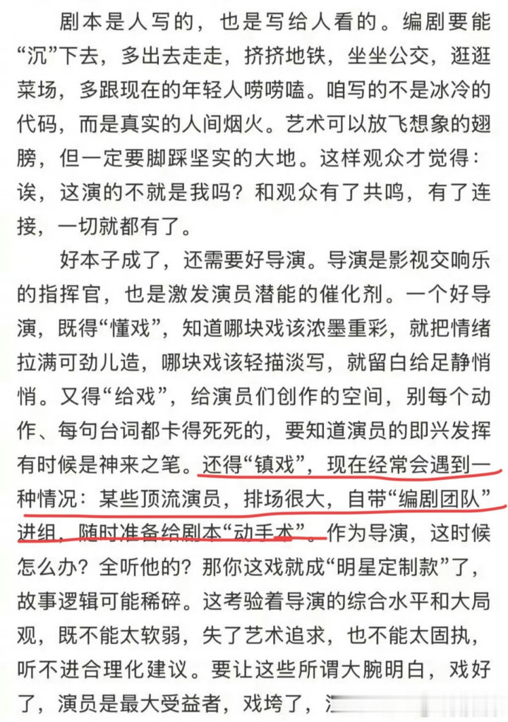 他还提到娱乐圈现在有个普遍现象,某些顶流演员排场很大,会自带编剧进组修改剧本,想把某部剧变成为他们量身定制的故事。